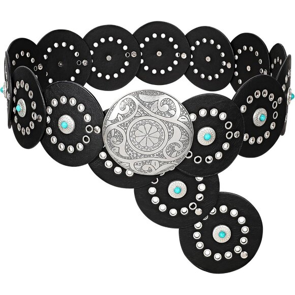 Stylish Western Belt: This wide PU leather belt features a classic cowgirl/cowboy design with a big concho buckle and decorative disc with turquoise, perfect for adding a touch of vintage western flair to any outfit.