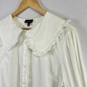 Features - Peter Pan Collar, white, button up, ruffled sleeves
