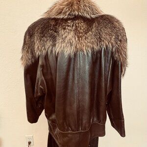 Vintage 80s style brown leather jacket with genuine American racoon fur trim. This jacket is heavy and warm. Features: Fully lined, front pockets, inside pocket, very soft supple leather, 2 button closure, shoulder pads. The racoon fur on this jacket drapes over the shoulders and part way down the back. Perfect coat for cold days.