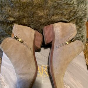 Franco Sarto Suede Pointed toe Ankle Booties, zip closure for easy on & off . 1.75” heel, color Tan, size 6 1/2, very confortable for walk, a weekend must have.