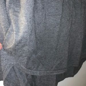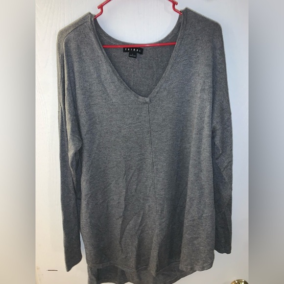 Basic long sleeve sweater. Has a v neck cut on it. The back is longer and has a little cut effect on the bottom. Perfect basic for winter to wear under a trench coat or on its own.