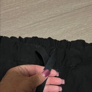 These black pants have a lot of stretch in the waist they are a size large. They have a drawstring. There are pockets in the front and the back, and it says perspective down the leg in white lettering. These pants came from a boutique.