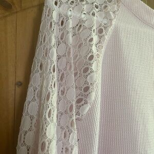 Soft pink blouse with lace arms and puffed slightly at the wrist cuff. Sooooo cute with jeans. Sz xl