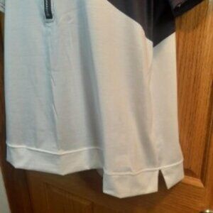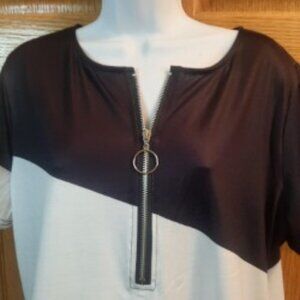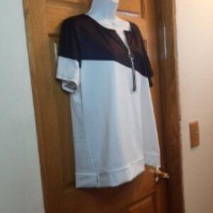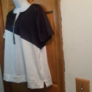 Brand new never worn. Short sleeve black and white polyester / cotton blend blouse. Features working zipper for ease of access when dressing. Pit to pit measurement is 23 inches and shoulder to bottom of hem is 26 inches