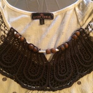 This is a beautiful brown and cream color top. Material is stretch with crotchet pattern at the neckline. Brand is Almost Famous. Size large.