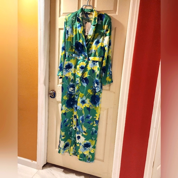 multi floral jumpsuit, blazer style top with shoulder pads, front zipper, long sleeves gold button hardware.