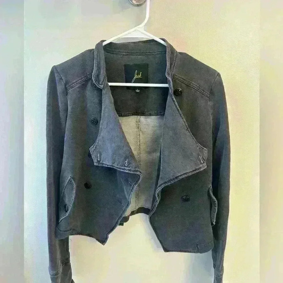This is a dark gray woman's size large jacket made by Jack. 95% cotton 5% spandex awesome jacket that can be worn open or closed with a little bit of stretch in it. Pit pit is 19 inches length overall 19 inches arm length 24 excellent condition.