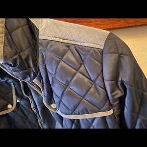 Blue nylon diamond pattern with gray suede shoulders and trim