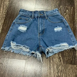 Woman’s Jean shorts with distressing detail on the front with a raw hem. Side xxs- petite.