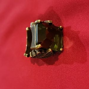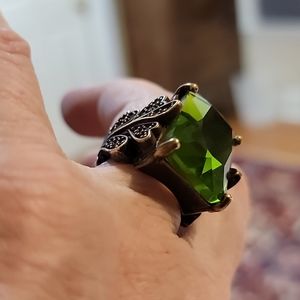This is a statement ring, no doubt about it ...it's heavy, it's big and it's tough as h*ll! The center stone is a huge green crystal cut translucent focal point and the hardware embracing it is silver/bronzish patina, with floral decor on the sides, embellished w tiny diamond crystals.