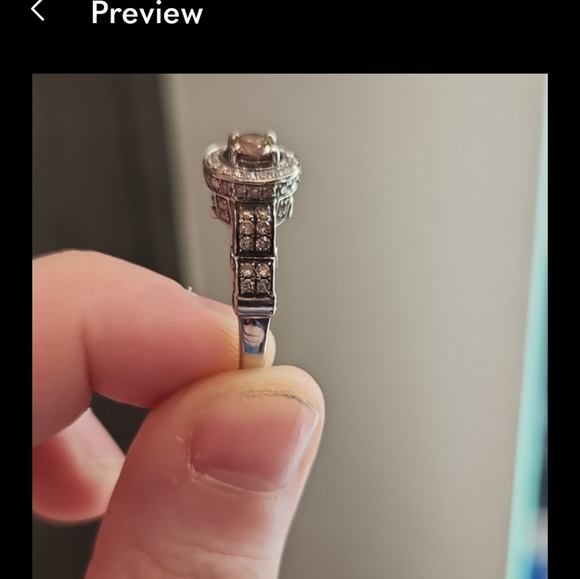 le vain ring size 7.5 to 8 has chocolate and white diamonds beautiful ring but it's hard to find a band to match it without being custom made so I'm looking to sell it