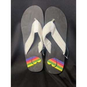 Add a touch of fun to your summer wardrobe with these black flip flops for women. These sandals feature a heart and rainbow design, perfect for a day at the beach or a casual outing. They come in size L (10-11). Perfect for those who love to keep it comfortable and stylish in equal measure.