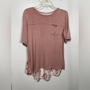 Woman’s Maunces size L tee shirt. Has beautiful floral, satin feeling back. Very pretty tee shirt!