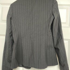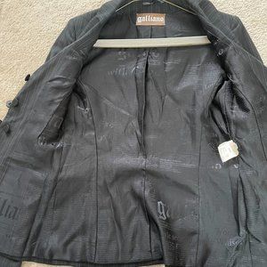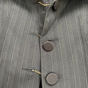 Very rare from famous house of Dior John Galliano woman's pinstriped black and grey blazer, the fabric is a blend and the closure buttons are very unique as they are attached by chains so very Galliano, The lining is a tell tail sign its a unique and authentic Galliano as the lining has that news paper print all over and the blazer is in excellent used condition. Contact me if serious for measurements.
