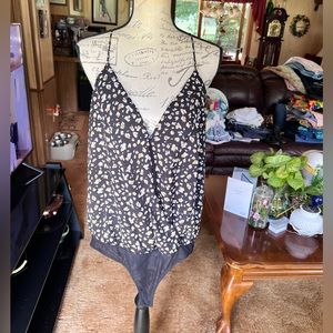 Woman’s super cute Nine Britton brand cheetah print bodysuit. This bodysuit is in good used condition no stains or rips the front has a few very small pin holes not visible or possible to get in pictures. The material is 100% polyester lining 100% polyester contrast 95% polyester 5% spandex. The size is XL the approximate measurements are. Total length 27” pit to pit 22” crotch to top 32”. This bodysuit is a wrap front has a button at the chest. The bottom has two snaps the spaghetti straps are adjustable. This bodysuit is in a black color with white and orange cheetah print. Super cute and comfortable very stylish. Perfect for the summer and fall this bodysuit can be styled up or down with black pants or. Dressed down with your favorite jeans and sneakers.