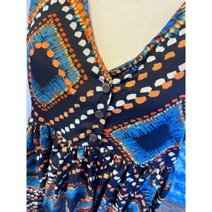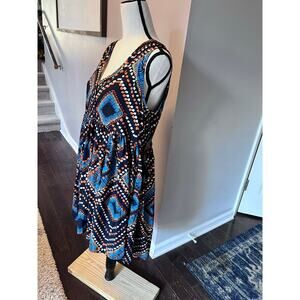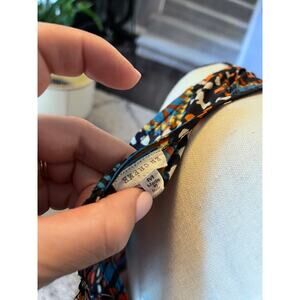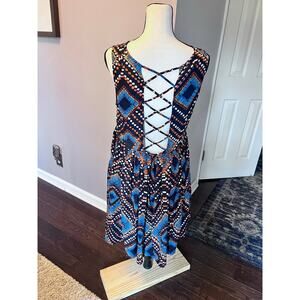 Woman's sz M - Blue Print DRESS - en creme - Open back w lattice - silky polystr