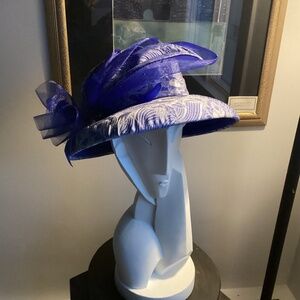 Beautiful in every way meticulouslystored. Silver glitter cobalt blue huge flower n feather accent 100 % wool interior inside is also cobalt blue. Maybe needs to set on form to keep shape. VERY GENTLY USED HAT. Just a stunner.
