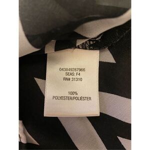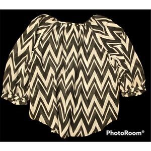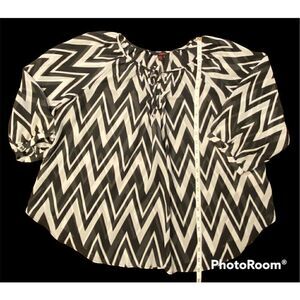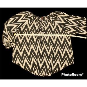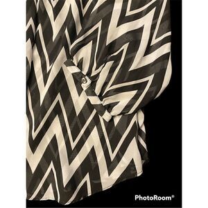 This is a woman’s stylish Bongo SZ L sheer blouse. It is black and white zigzag print with a keyhole and ties in front. It also buttons at the bottom of sleeves. Material and measurements are in the pictures. Could be worn dressed up or casual. In very good clean condition!