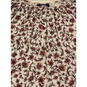 This is a woman’s Chaps SZ S/P/CH pink and white stylish floral print blouse with bell sleeves. It’s light and airy with buttons on the top in front. Made in India of 60% cotton and 40% modal. Can be worn dressed up or casual. In very good clean condition!
