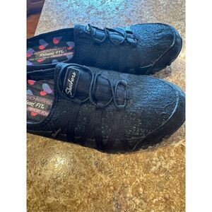 Woman’s Skechers relaxed fit air cooled memory foam slip on lace slip on shoes size 8. Very gently worn. Extremely comfortable foot bed. They have a lace/glitter look to them. They are black and color. Smoke free and clean home.