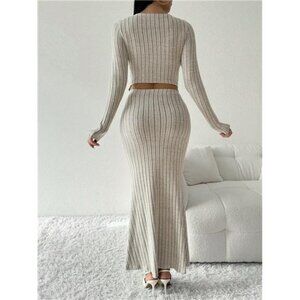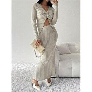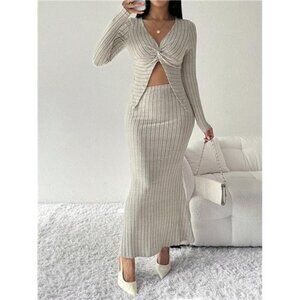 Women 2pcs Set Solid Color V-Neck Twist Design Slit Long Sleeve Top And Skirt