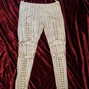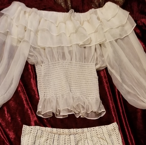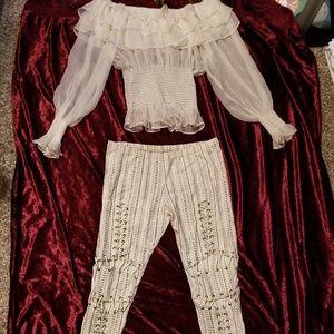 Arden B medium off the shoulder blouse 100% polyester. I posted an additional pic showing the seam in the midriff has unraveled. Style Staker size 8 leggings cute fun for the summer. Sold together or separately