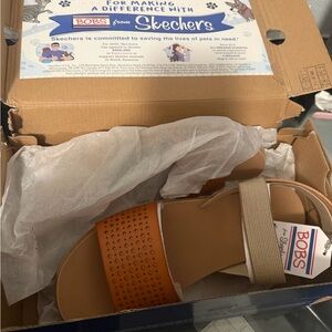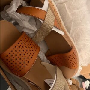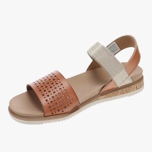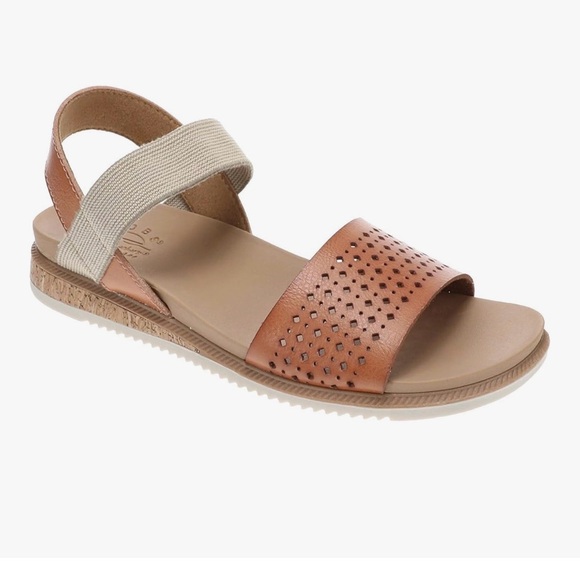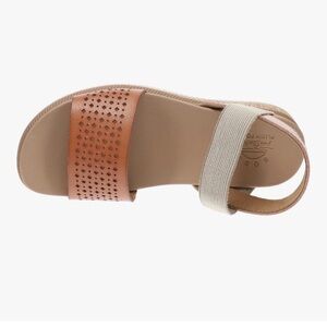 Chic tan sandals with perforated strap. Comfortable elastic back color is Dessert Kiss Low color is. Saddle