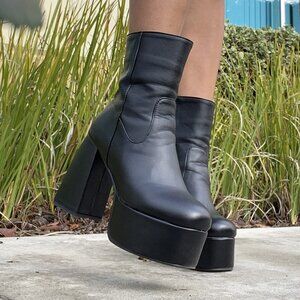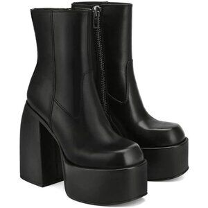 🆕Women A Black Pu Leather Chunky High Heel Square Toe Side Zipper Stretch Boots