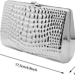 Features: This chic evening handbag features a sleek acrylic and metal design with a dazzling silver sparkle finish, perfect for making a statement. Compact and lightweight, it easily holds your phone, lipstick, keys, and essentials, so you’re ready for any celebration.
