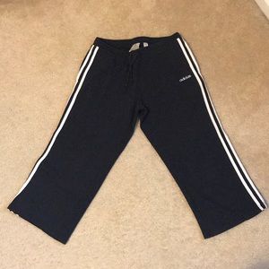 Womens Adidas Black Capri Pants; Size Medium; Black with Three White Stripes on the side of each leg; 21 inch inseam; Worn.