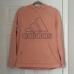 Excellent condition Adidas Hoodie. Size Women's Medium. Climawarm line. Peach/Coral color, with blue print. CLIMAWARM has insulating materials that trap warmth for optimal body temperature. Stay dry inside with sweat-wicking fibers that keep skin dry and comfy. Dial up warmth retention with first layer comfort to boost heat.