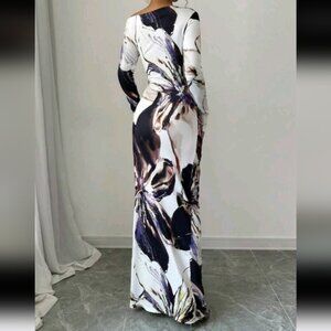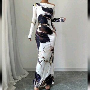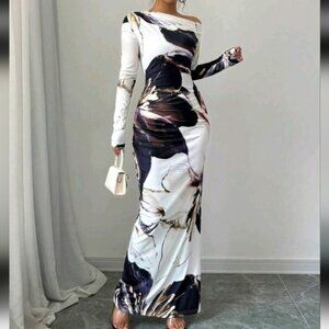 Women All-Over Allover Print Asymmetric Neckline Long Sleeve Waisted Dress