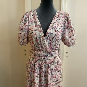 This beautiful mini dress from French connexion features a stunning floral pattern in shades of pink. The dress has a V-neckline, short balloon sleeves, and a zip closure. The side cutouts add a touch of preppy style to the dress, making it perfect for a variety of occasions, including travel, holy communion, parties, and formal events. The dress is made of high-quality cotton material, ensuring comfort and durability. It is a regular size 8 and has a short length, making it suitable for summer, fall, winter, and spring.