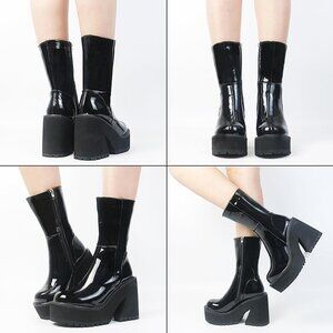 ⚡Women A-patent Black Prime Synthetic Wedge Heel Ankle Platform Round Toe Boots