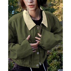 Women Army green Cropped Utility Cargo Coat Contrast Collar Barn Outwear