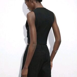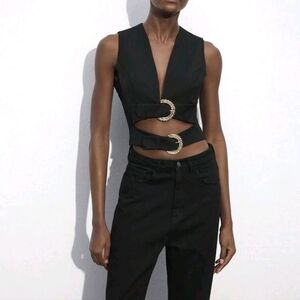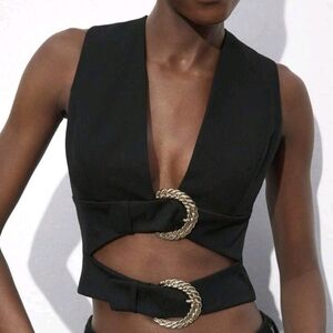 Women Autumn Black Double-Buckle V-Neck Hollow Structure Elegant Short Vest