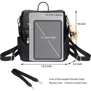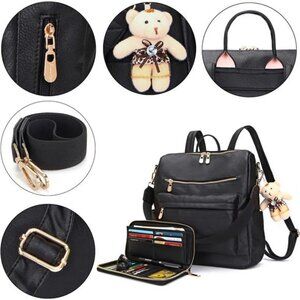 MATERIAL: Backpack purse made of high quality vegan leather and polyester lining with durable gold hardware. Highly anti-scratch and tear-resistant, which is fashionable and durable. ROOMY:Backpack purse: 1 main compartment with 1 inner zipper pockets, 2 inner slot pocket, 2 front zipper pockets, 2 side pockets and 1 back zipper pocket. Multi-pockets are enough for you to hold your things like 14" or under laptop, iPad, A4 files, books, umbrella, sunglasses, cosmetics and other daily things, keep your daily items well organized. SPECIAL DESIGNS: Two zippers design on main bag. Bear doll accessories looks more cute. Multipurpose design easy conversion handbag backpack purse and shoulder, you can use it as backpack, top handbag or shoulder bag. DIMENSION: Backpack: 12.2" x 14" x 5.2"(W*H*D), Wallet: 8" x 4.2"(W*H). Occasions: Perfect for everyday living, working, shopping, dating, traveling, vacation, etc.
