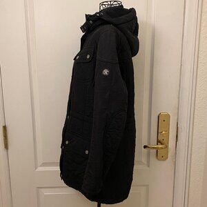 Detachable Hooded, lined in fleece, black corduroy trim collar
