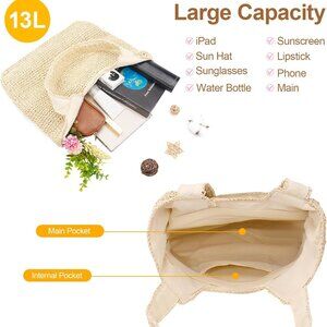 Features: Chic boho style straw tote with leak-proof polyester lining, designed to keep your small items safe and dry. Sturdy reinforced shoulder straps won’t deform, and the zipper closure adds extra security. Spacious 13L capacity with one large compartment and a handy inner pocket, perfect for carrying your laptop, books, wallet, and more. The foldable design makes it super travel-friendly—just fold it up and pop it in your suitcase!