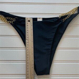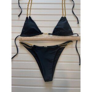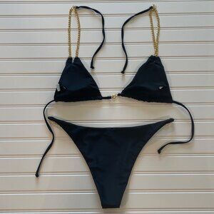Women Bikini Swimsuit NWT Large Black 2 Piece Triangle Gold Chain Strap Tie Side