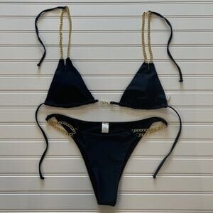 Women Bikini Swimsuit NWT Large Black 2 Piece Triangle Gold Chain Strap Tie Side