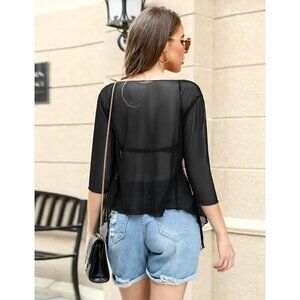 Women Black 3/4 Sleeve Sheer Mesh Shrug Tie Front Cropped Bolero Cardigan