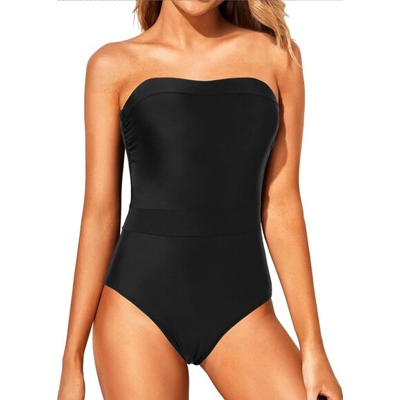 Women Black Bandeau One Piece Swimsuit Tummy Control Bathing Suit Halter size L