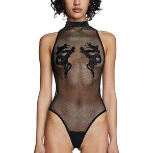 ⚡Women Black Dolls Kill Bad Luck Dragon Fishnet Bodysuit High Neck Bodysuit