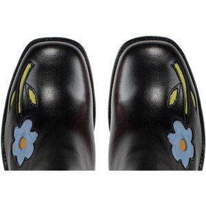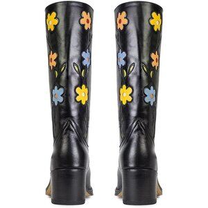 🆕Women Black Faux Leather Knee High with Flowers Square Toe Chunky Heel Boots
