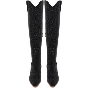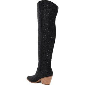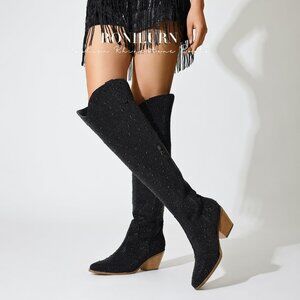 Women Black Faux Leather Sparkly Bling Rhinestone Over the Knee Cowboy Boots