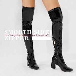 Women Black Patent Leather PU Chunky Heel Over The Knee Square Toe Long Boot