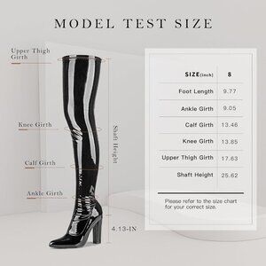 SEDUCTIVE HEIGHT DESIGN: Heel measures 4.13 inches(approx). The carefully measured calf and thigh girth offer a tailored fit. PLEASE NOTE: Please measure your calf and thigh circumference carefully before ordering. If your feet are larger or wider, we recommend taking one size up.