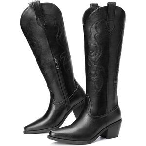 Women Black Polyurethane Classic Embroidery Side Zipper Knee High Western Boots