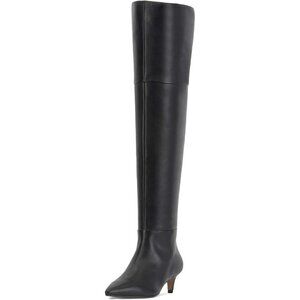 Women Black Pu Thigh High Pointed Toe Kitten Heel Over the Knee Long Boot